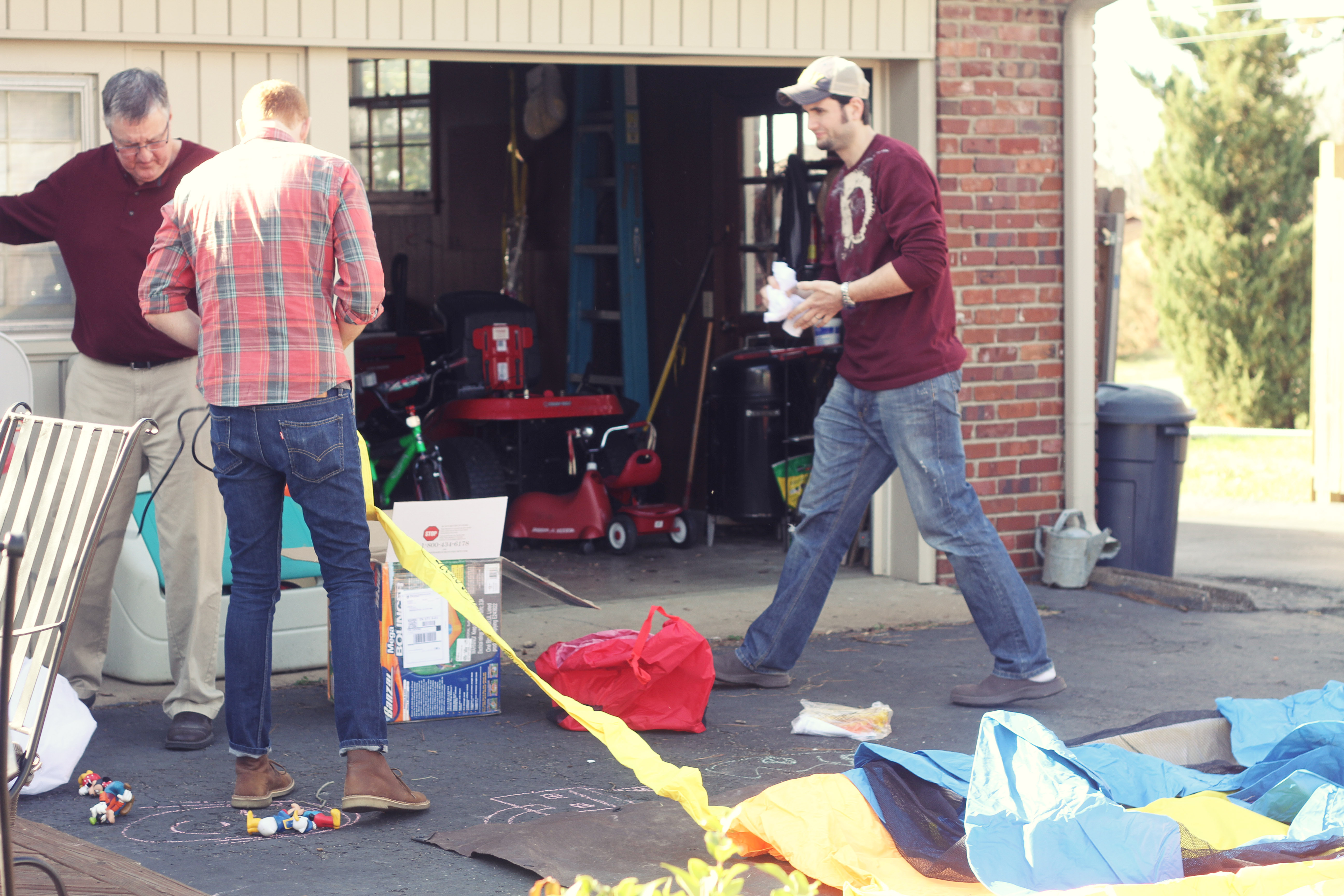 Poppy, Daddy and Uncle Brent blowing up the bounce house.